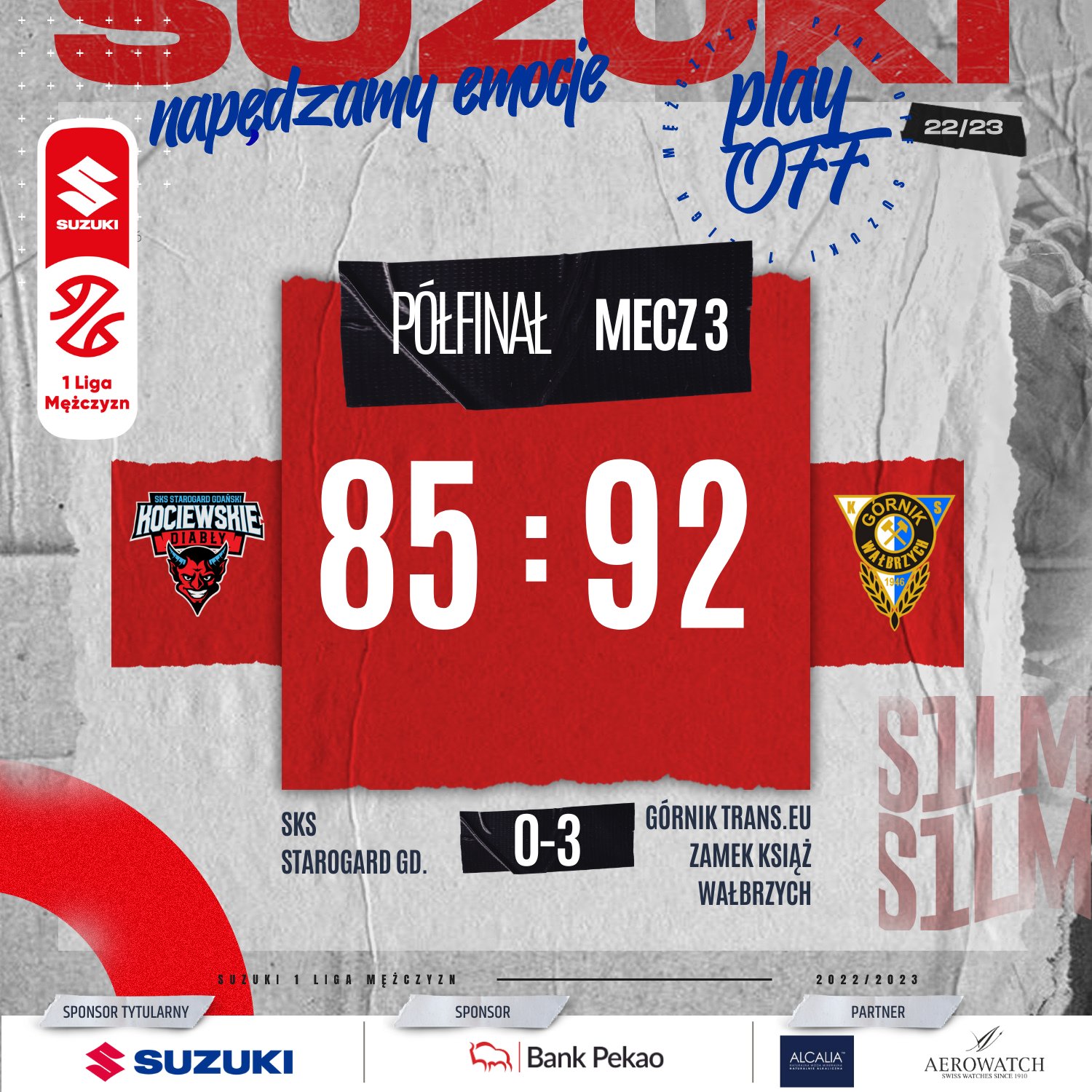SKS był blisko, potrafił zbliżać się na odległość jednego trafienia z gry, ale niemal przez całe trzecie spotkanie półfinałowe przewagę utrzymywali wałbrzyszanie. Wyjątek nastąpił w połowie drugiej kwarty, gdy po dwóch trójkach Daniela Venzanta SKS uzyskiwał przewagę, w tym największą trzypunktową do, której doprowadził Daniel Ziółkowski.