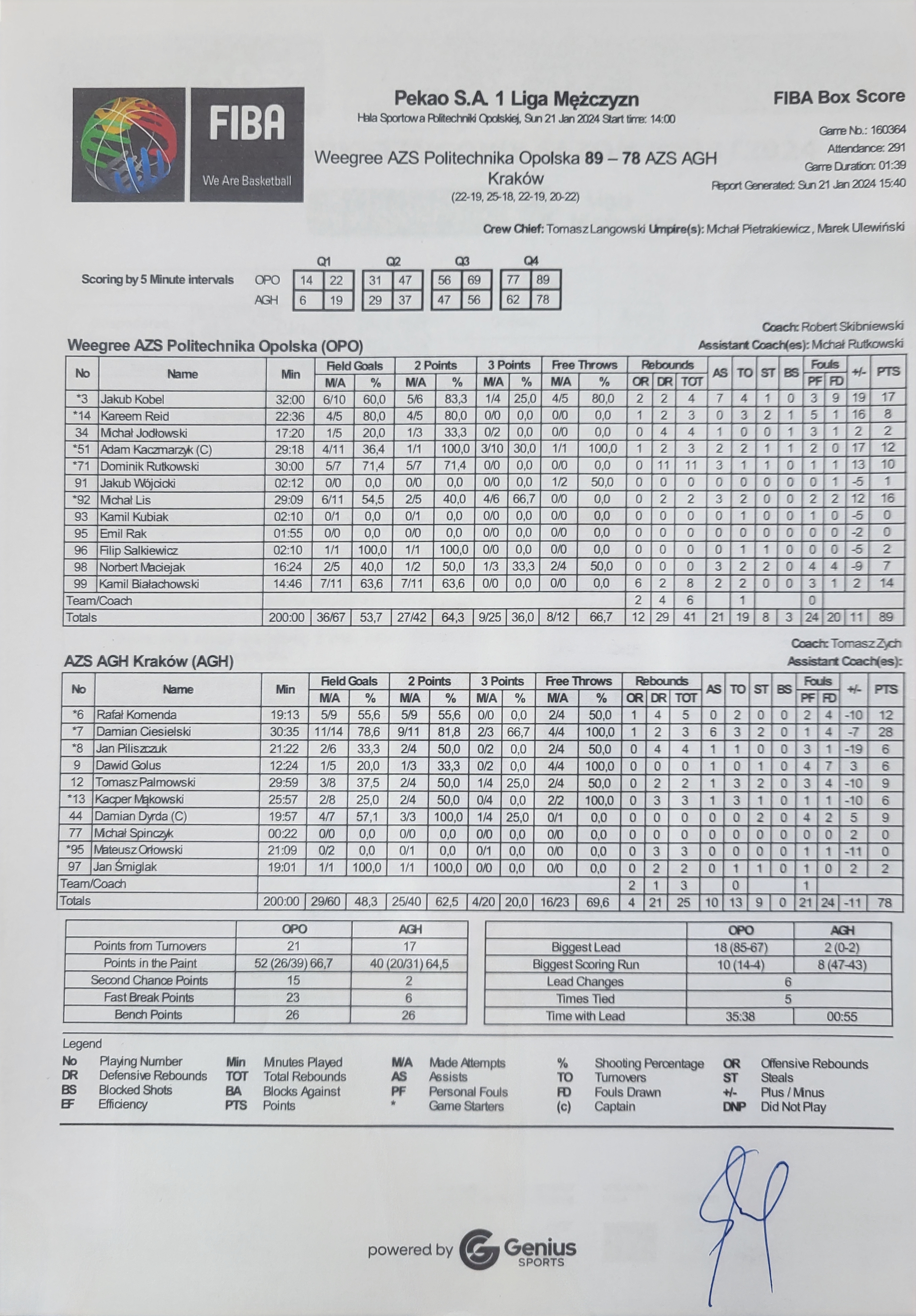 | 44 | Damian Dyrda | 9 | 19:57 | 3/3 | 100.0 | 1/4 | 25.0 | 4/7 | 57.1 | 0/1 | 0.0 |   |   |   |   | 4 | 2 |   | 2 |   |   | 7 | 5 | |