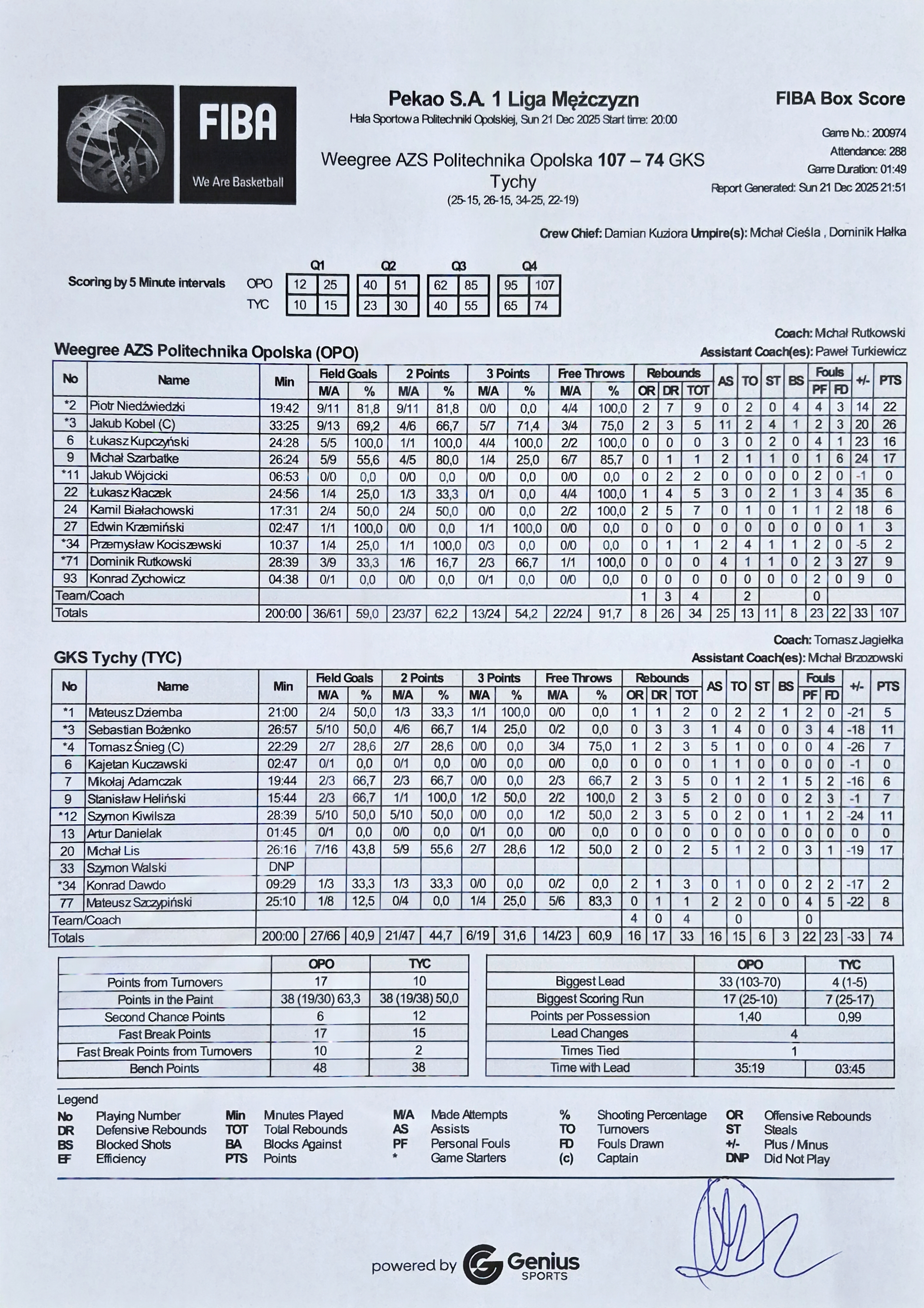 | 22 | Łukasz Kłaczek | 6 | 24:56 | 1/3 | 33.3 | 0/1 | 0.0 | 1/4 | 25.0 | 4/4 | 100.0 | 1 | 4 | 5 | 3 | 3 | 4 |   | 2 | 1 |   | 14 | 35 | |