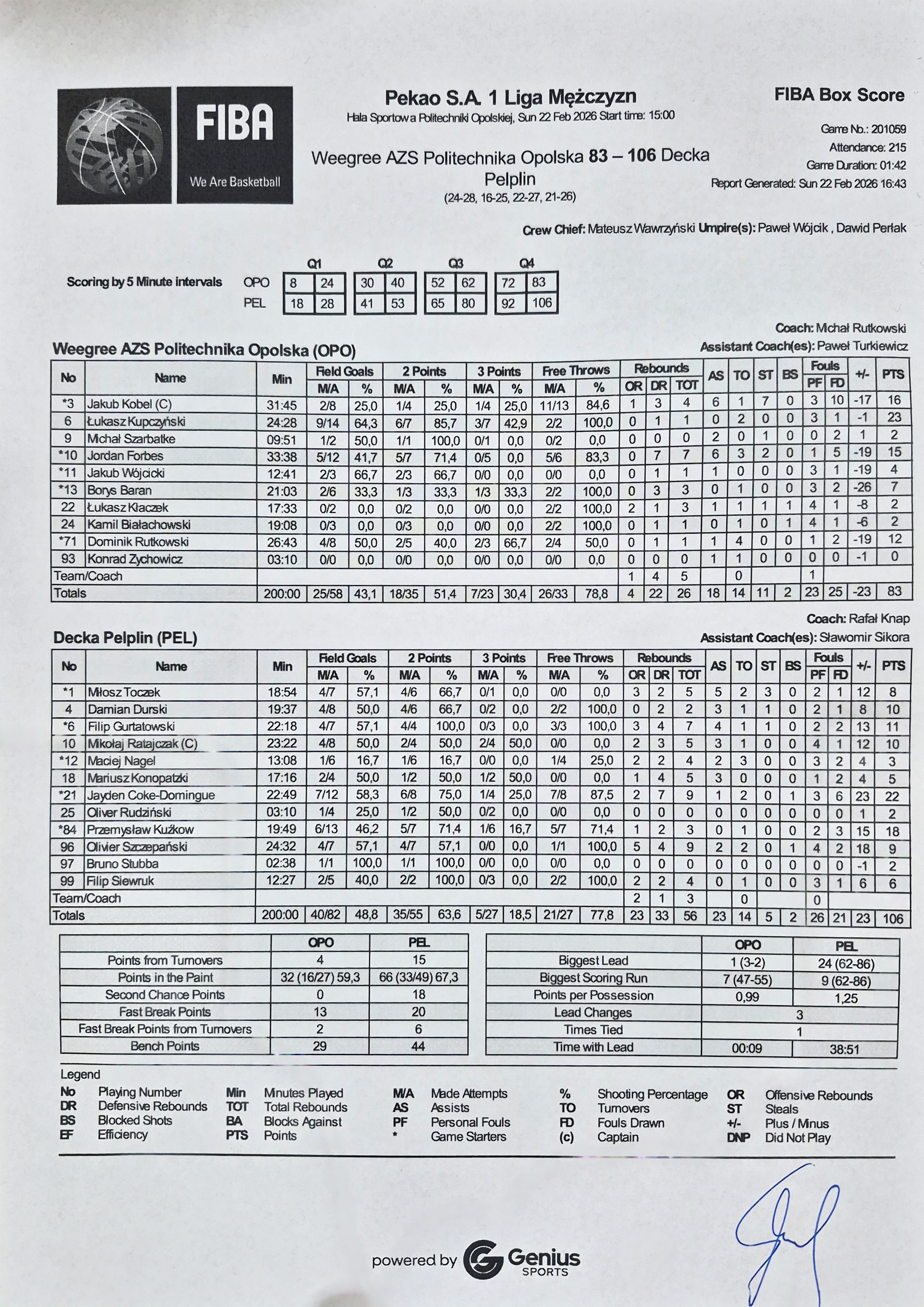 | 4 | Damian Durski | 10 | 19:37 | 4/6 | 66.7 | 0/2 | 0.0 | 4/8 | 50.0 | 2/2 | 100.0 |   | 2 | 2 | 3 | 2 | 1 | 1 | 1 |   |   | 11 | 8 | |