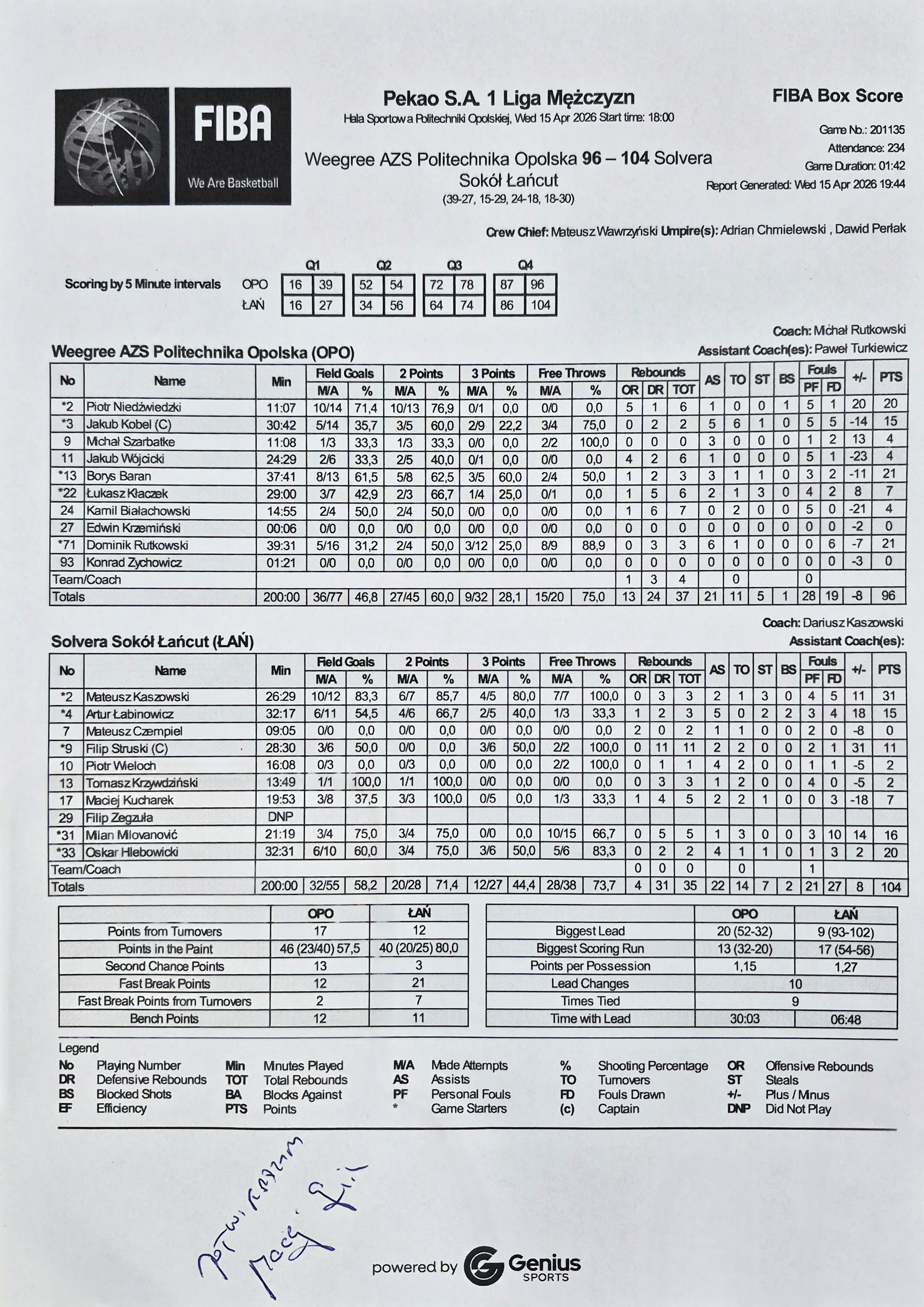 | 2 | Mateusz Kaszowski | 31 | 26:29 | 6/7 | 85.7 | 4/5 | 80.0 | 10/12 | 83.3 | 7/7 | 100.0 |   | 3 | 3 | 2 | 4 | 5 | 1 | 3 |   |   | 36 | 11 | |